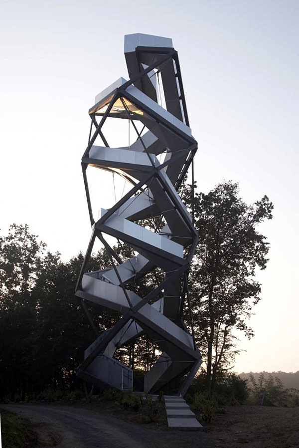 Tuhle rozhlednu najdete nad řekou Mur na hranicích Rakouska se Slovinskem. Její plášť tvoří efektní hliníkové spirály, které zajišťují dokonale oddělené a přitom prolínající se cesty návštěvníků, kteří šplhají po schodech vzhůru a těch, co už jdou dolů.