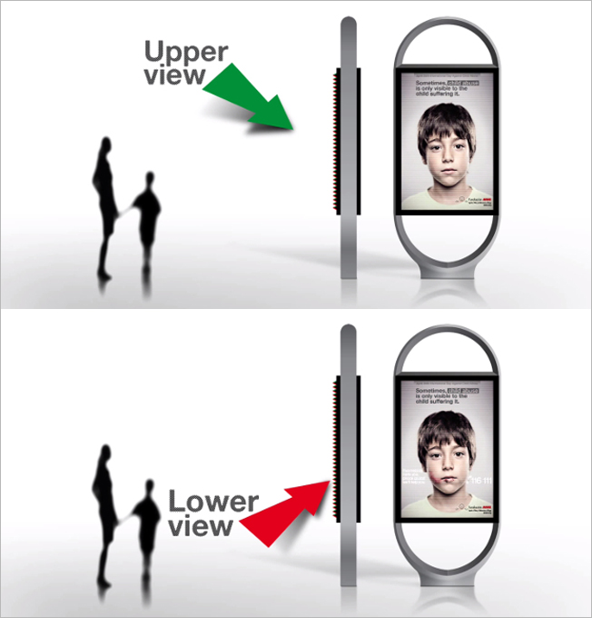 V konkrétním případě tohoto osvětového plakátu vidí všichni, kdo jsou vyšší než 138 centimetrů, verzi pro dospělé. Průměrná výška dětí do 10 let je totiž 135 cm a z takového úhlu už je na plakátě vidět poselství o ochraně a kontakt.